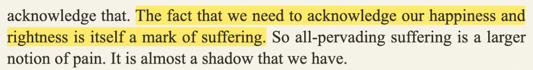 Fairly standard “all is suffering” stuff, I’m used to seeing it, but it still doesn’t land with me anymore. “Always keep in mind that even when you’re happy, that’s suffering too.”