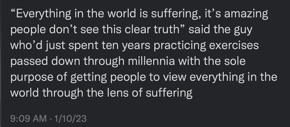 Telling people “everything is suffering; you won’t get anywhere until you recognize that truth; other people might try to suppress your experience, but not me, I just want you to see clearly what is obviously ontologically true; all the good and wise people have already recognized it so you just need to get on our level” and then giving them exercises that have been passed down through millennia with the sole purpose of getting them to see the world through the lens of suffering—that’s not great.